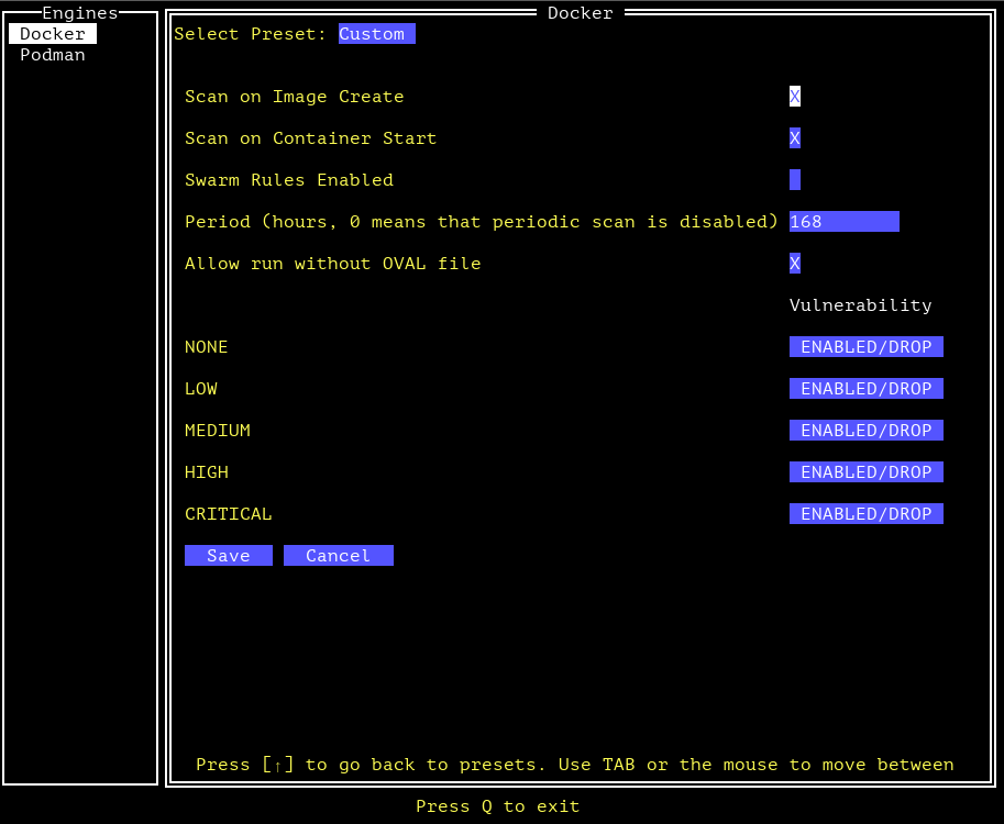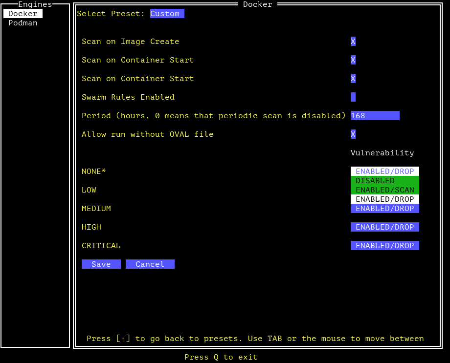 • Enabled/Drop - сканирование включено, в случае нахождения уязвимости контейнер останавливается и добавляется запись в журнал событий;