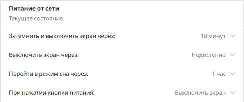 • указать интервал автоматического выключения экрана — выбрать нужное значение из выпадающего списка Выключить экран через;