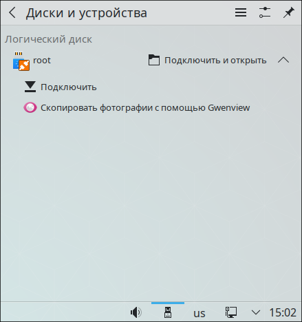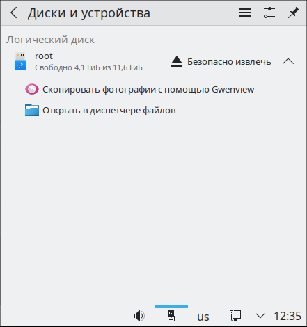 Для просмотра списка подключенных носителей и доступных действий с ними необходимо нажать на значок, при этом будет отображен виджет Диски и устройства.