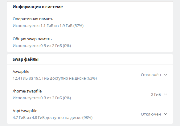 • в разделе Файл подкачки нажать Показать подробности. При этом отобразится информация об оперативной памяти и файлах подкачки. В секции Swap-файлы отобразятся разделы, в которых можно создать файлы подкачки;