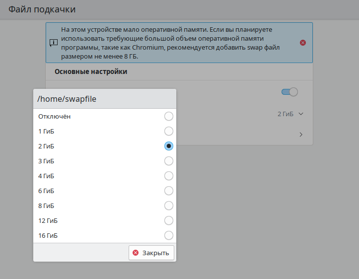 • для создания файла подкачки в определенном разделе нажать на поле в строке раздела, в открывшемся окне выбрать размер файла подкачки, затем ввести пароль администратора.