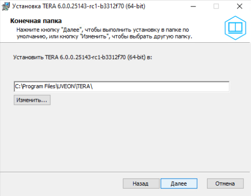• выбрать каталог установки или оставить значение по умолчанию (C:\Program Files\UVEON\TERA) и нажать экранную кнопку [Далее];