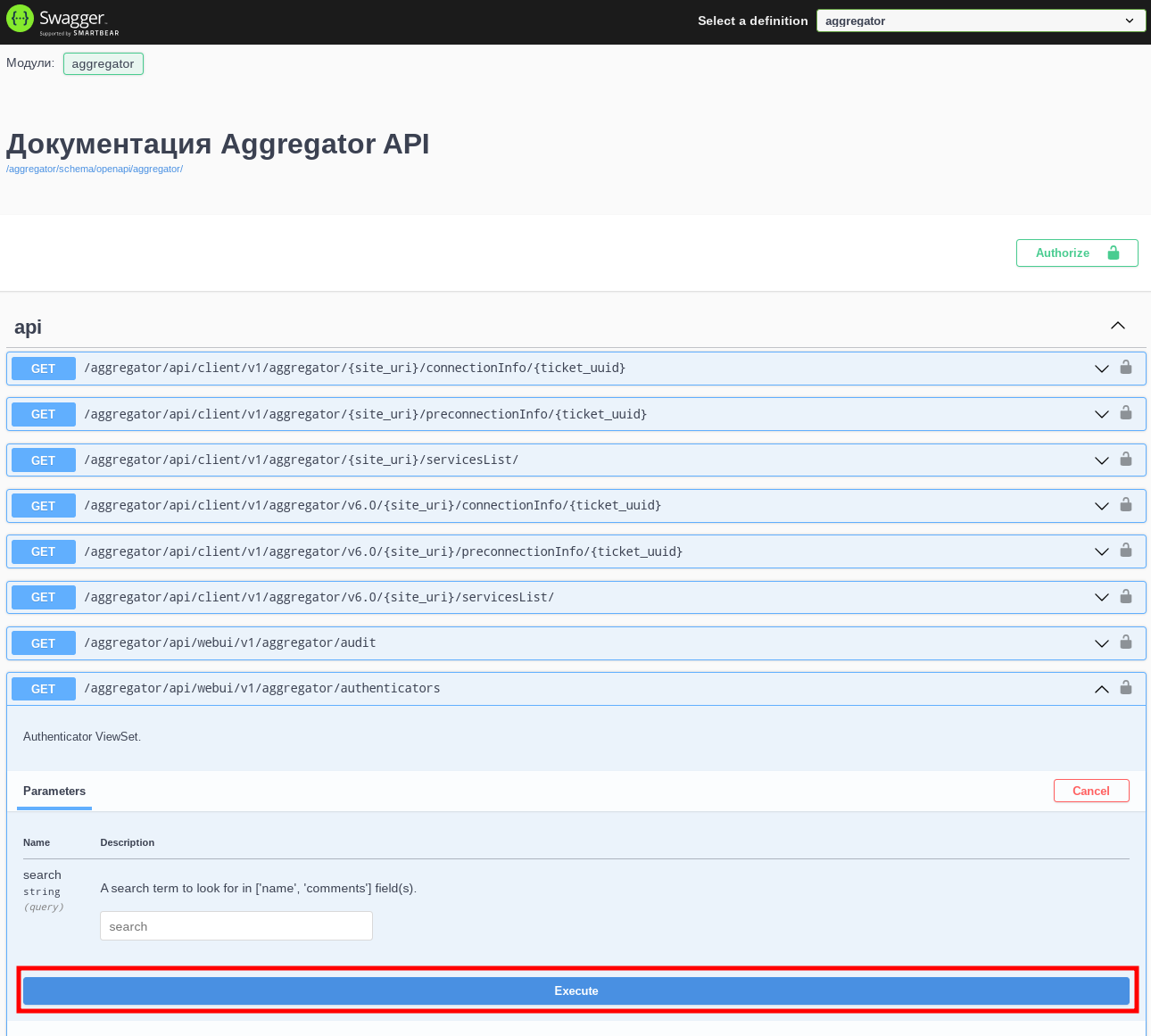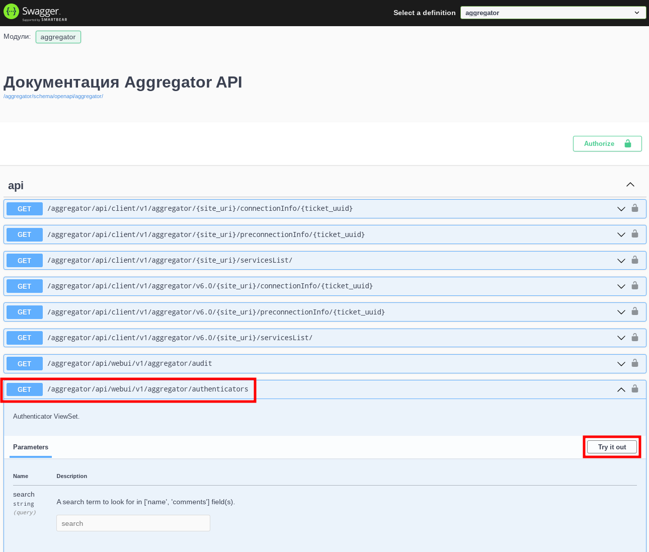 Доступ к некоторым командам может быть защищен. Для получения доступа к ним нужно нажать экранную кнопку [Authorize] и ввести ключ «legacyTokenAuth» (токен авторизации, см. подраздел Получение токена для доступа к REST API портала «Агрегатор»).