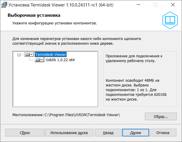 • после успешной установки ПО Termidesk Viewer пакет UsbDk установится автоматически.