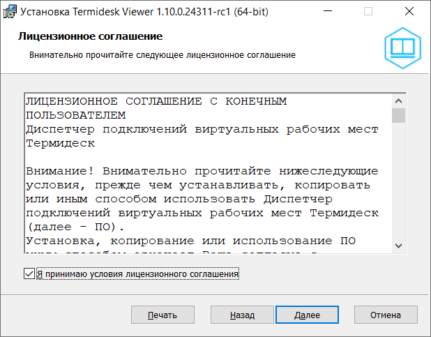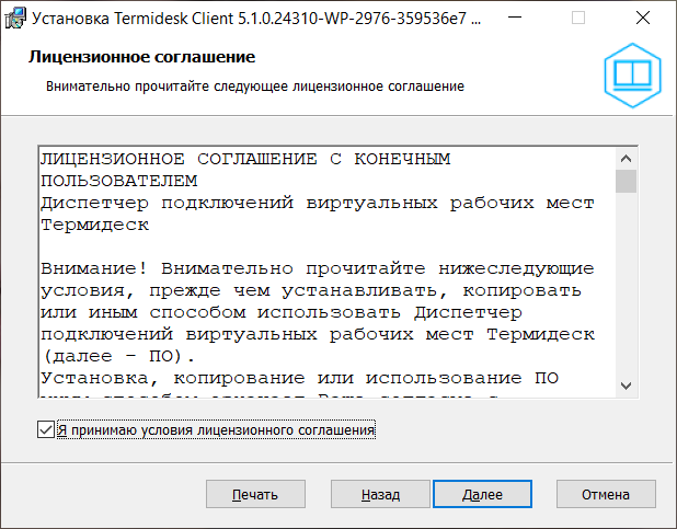 • ознакомиться с лицензионным соглашением. Для принятия условий лицензионного соглашения и продолжения установки следует отметить поле «Я принимаю условия лицензионного соглашения» и нажать экранную кнопку [Далее];
