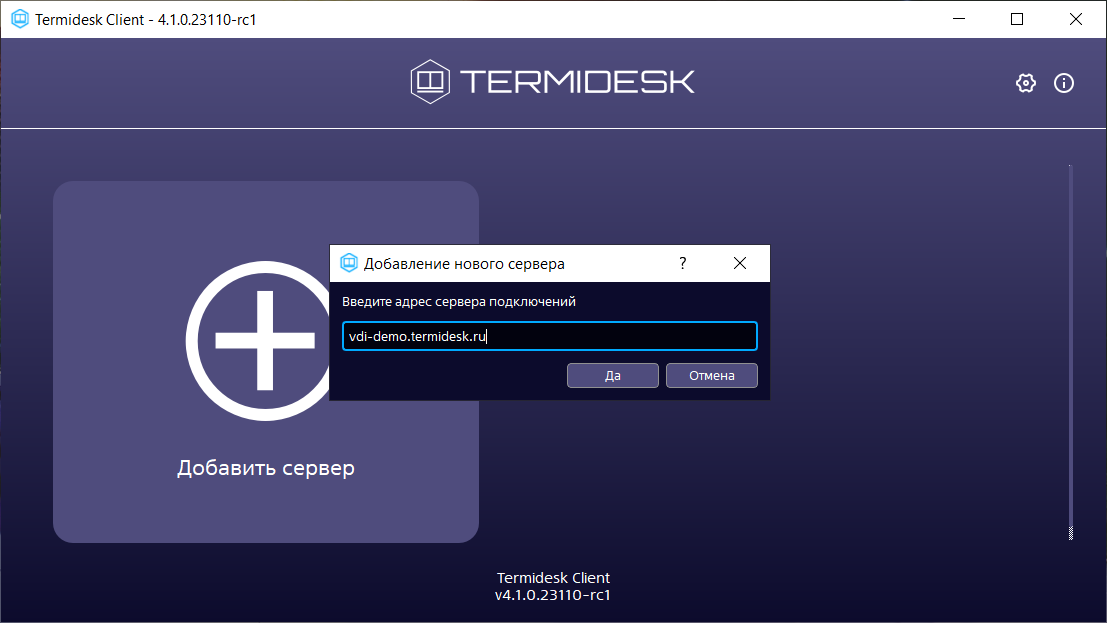 Для добавления сервера подключений необходимо щелкнуть левой кнопкой мыши по надписи «Добавить сервер» и в открывшемся окне ввести IP-адрес или доменное имя сервера подключений Termidesk