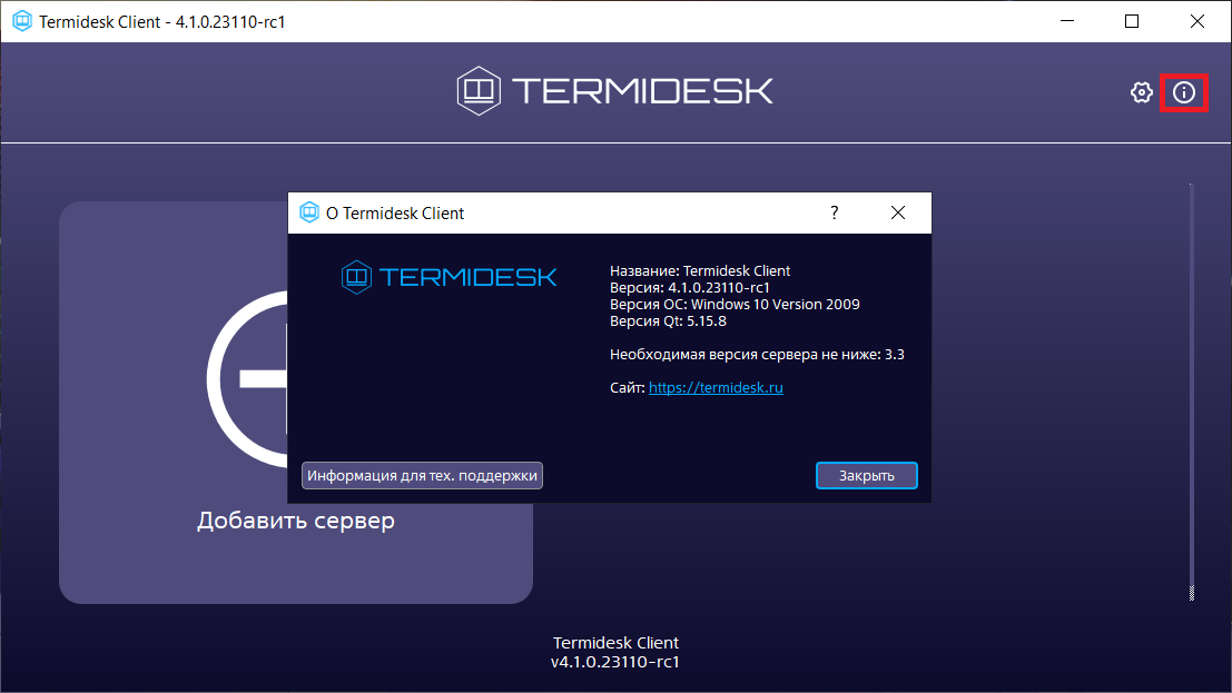 • «Необходимая версия сервера не ниже» - минимальная версия сервера Termidesk, с которым возможна работа текущей версии Клиента;