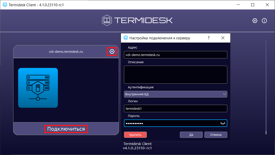 После заполнения указанных полей для подключения к выбранному серверу надо нажать экранную кнопку [Подключиться]. Для изменения параметров аутентификации на сервере подключений необходимо нажать на графический элемент в виде шестеренки в правом верхнем углу для выбранного сервера.
