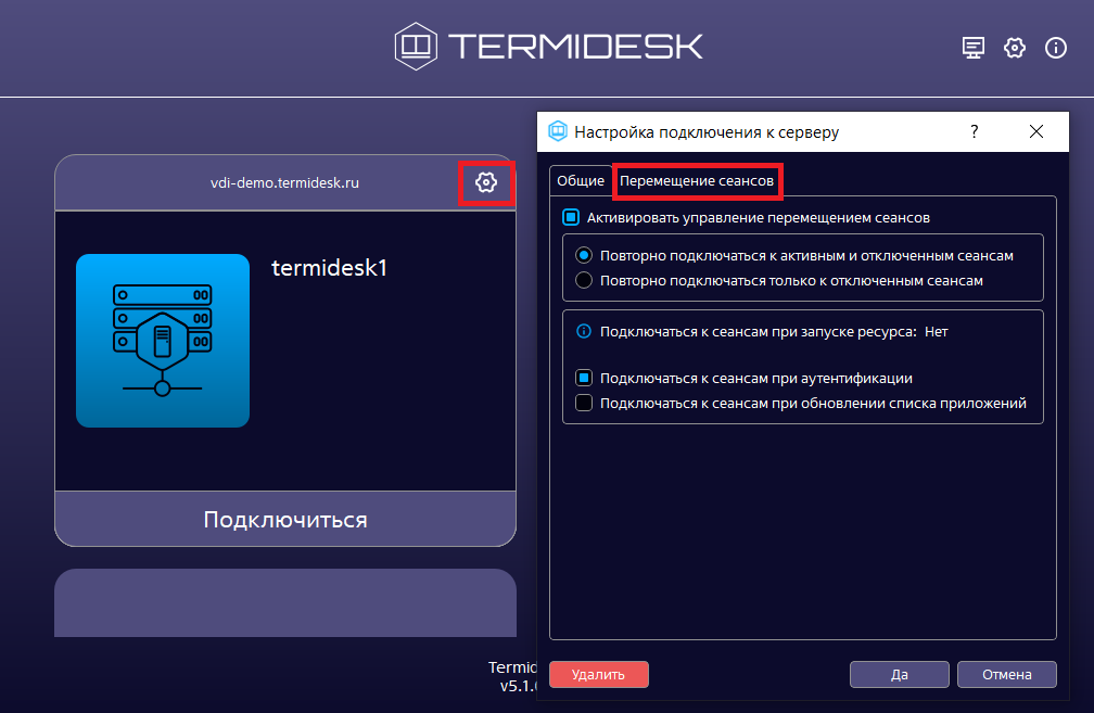 Для настройки параметров переподключения нужно нажать на графический элемент в виде шестеренки в правом верхнем углу для выбранного сервера. В открывшемся окне «Настройка подключения к серверу» на вкладке «Перемещение сеансов» будут доступны следующие параметры управления: