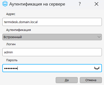 При первом запуске Клиент выполнит запрос информации о сервере. В случае успешного выполнения запроса в окне «Аутентификация на сервере» отобразится адрес сервера Termidesk.