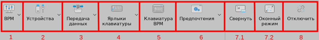 В полноэкранном режиме панель инструментов ПО Termidesk Viewer автоматически скрывается. Чтобы набор инструментов отображался статически необходимо в графическом элементе (6) выбрать строку «Отображать панель инструментов в режиме полного экрана».