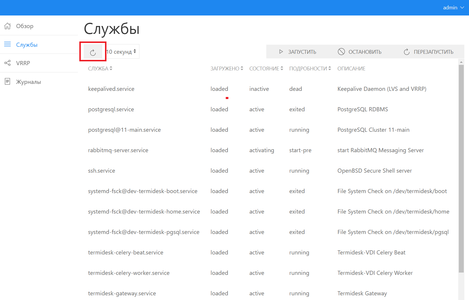 Для просмотра состояния служб, критичных для ВМТ, необходимо перейти в функцию «Службы» веб-интерфейса ВМТ.