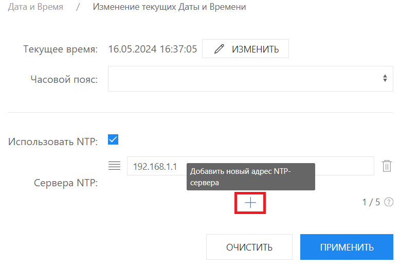 • воспользоваться экранной кнопкой [+] и ввести IP-адрес или FQDN сервера. Поддерживается добавление до пяти (включительно) NTP-серверов. Если сервер недоступен, будет выведено соответствующее сообщение;