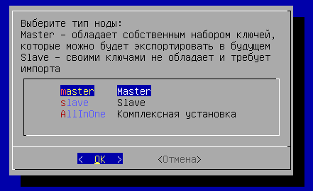 - далее необходимо выбрать тип ноды ВМТ «master» - нода обладает собственным набором ключей, используемыми в Termidesk для проверок пересылаемых между компонентами данных и состояния API. Этот тип ноды автоматически устанавливается с ролью «Менеджер рабочих мест»;