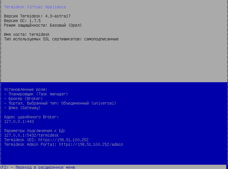 После выполнения шагов по первичной настройке произойдет переход в окно управления ВМТ. Службы Termidesk будут автоматически активированы, перезагрузка не требуется. IP-адрес, отображаемый в главном окне ВМТ, соответствует IP-адресу первого настроенного интерфейса.