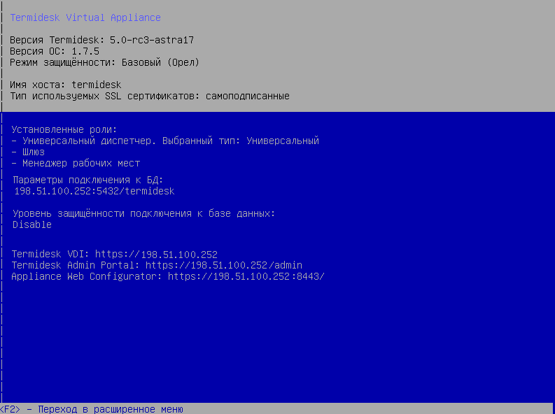 После выполнения шагов по первичной настройке произойдет переход в окно управления ВМТ. Службы Termidesk будут автоматически активированы, перезагрузка не требуется.