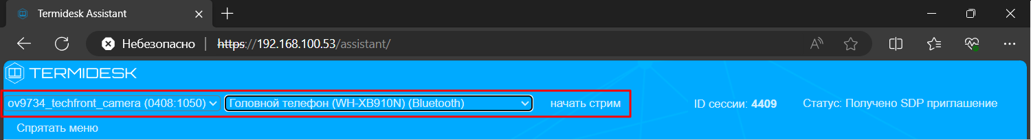 При подключении по протоколу HTTPS левом верхнем углу вкладки отобразится меню выбора устройств. В раскрывающемся списке нужно выбрать перенаправляемые микрофон, камеру и нажать экранную кнопку [начать стрим]. В случае, если перенаправление устройств в браузере было запрещено, сразу будет открыто окно трансляции экрана, без отображения меню выбора устройств.