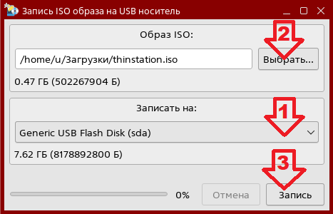 thinstation.iso, выбрав пункт «Образ ISO»; - начать запись образа, выбрав пункт «Запись».