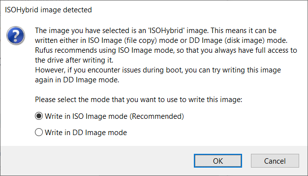 thinstation.iso. Убедиться, что параметру «Partition Scheme» присвоилось значение «MBR», параметру «Target system» - «BIOS or UEFI», параметру «Volume label» - «ThinStation»; - начать запись образа, нажав экранную кнопку [START]. На запрос «ISOHybrid image detected» выбрать вариант «Write in ISO Image mode (Recommended)». Подтвердить уничтожение данных на носителе и дождаться успешного окончания записи образа.