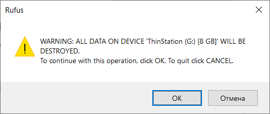 Подготовка загрузочного USB-носителя может выполняться через утилиты etcher или rufus. Рекомендуется использовать утилиту rufus, поставляемую в образе thinstation.iso.