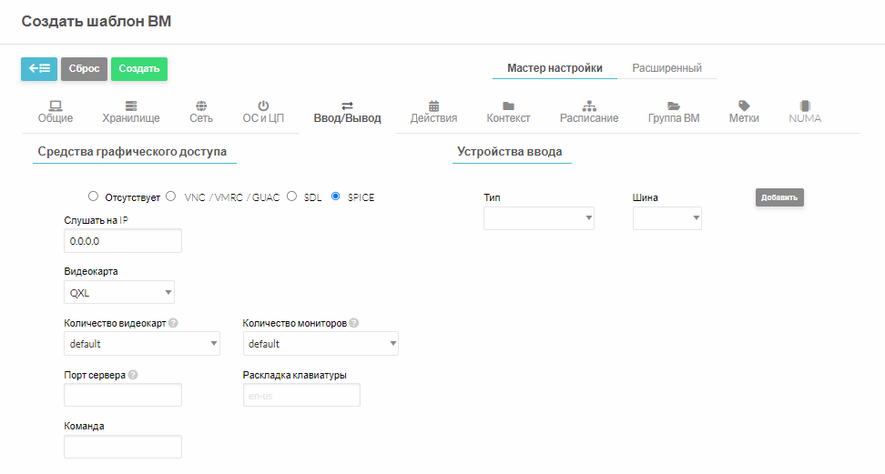 - перейти в «Ввод/Вывод», затем в поле «Средства графического доступа» выбрать значение «SPICE», а в поле «Видеокарта» выбрать значение «QXL»;