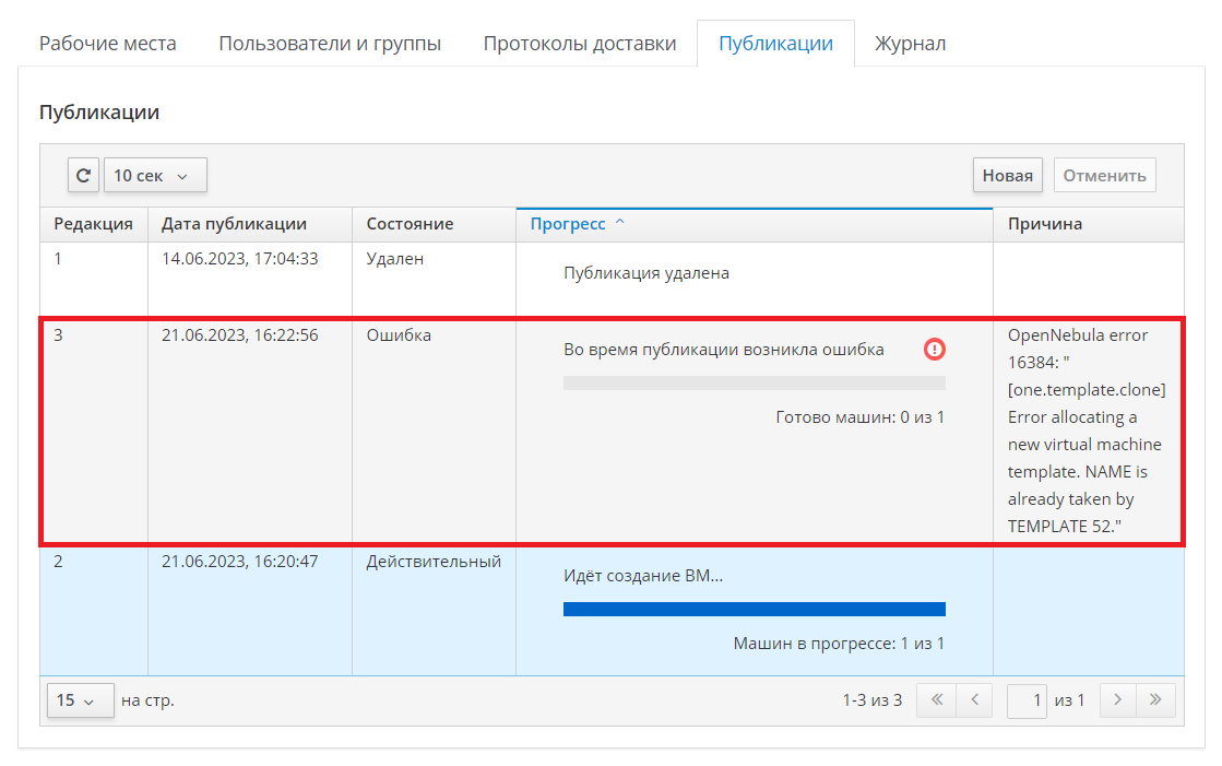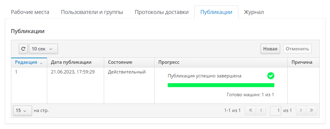 Прогресс выполнения публикации будет отображен в этом же разделе. Индикатор прогресса относится только к созданию ВМ в кеше (ВМ, поддерживаемых в определенном состоянии) и не отображает факт получения пользователем ВРМ.