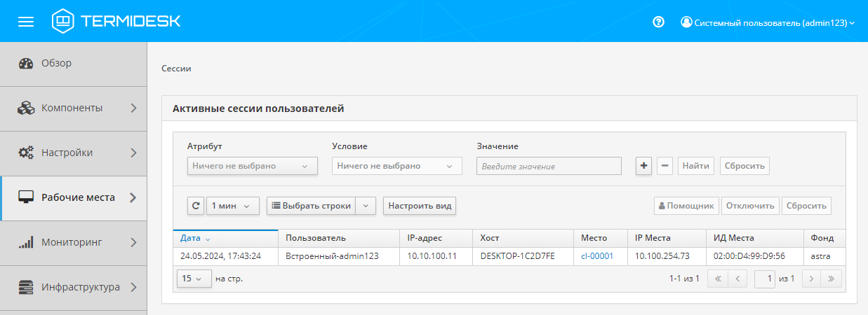 Функционал управления сессиями (отключение, сброс) пользователя из страницы «Рабочие места - Сессии» доступен для терминальных сессий.