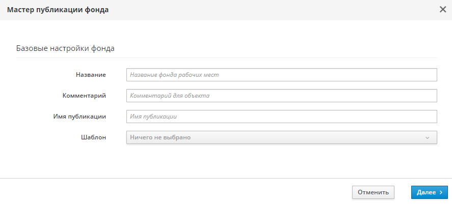 Откроется мастер публикации фонда. Необходимо заполнить параметры, указанные в таблице, и нажать экранную кнопку [Далее]. При нажатии экранной кнопки [Отменить], или клавиши <Esc>, или иконки «Крестик», на любом из этапов работы произойдет закрытие мастера без сохранения настроек.
