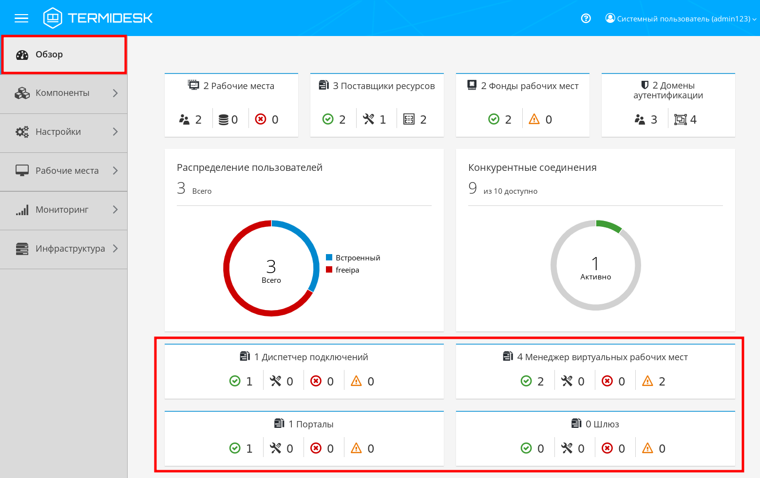 Раздел «Инфраструктура» предназначен для использования в качестве единого центра управления при распределенной установке Termidesk. Он позволяет централизованно управлять компонентами и просматривать их статус на сервере.