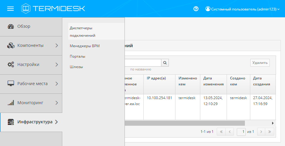 Для получения списка компонентов Termidesk нужно перейти в раздел «Инфраструктура» и выбрать интересующий элемент: