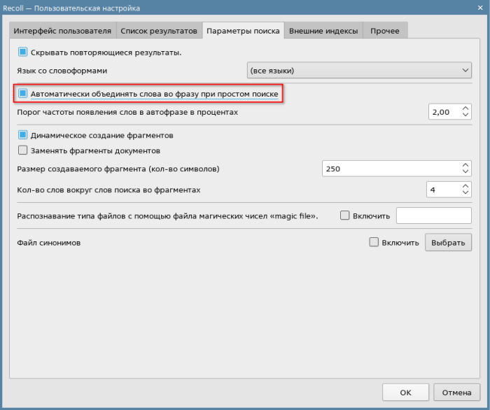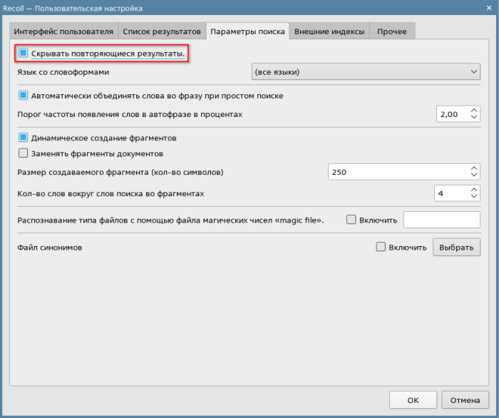 - в открывшемся окне Recoll — Пользовательская настройка следует перейти во вкладку Параметры поиска;