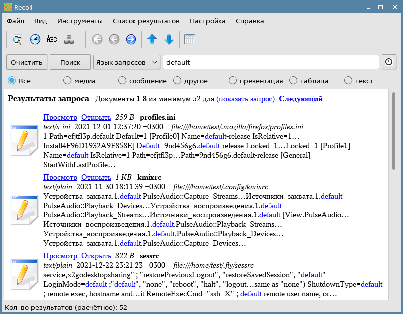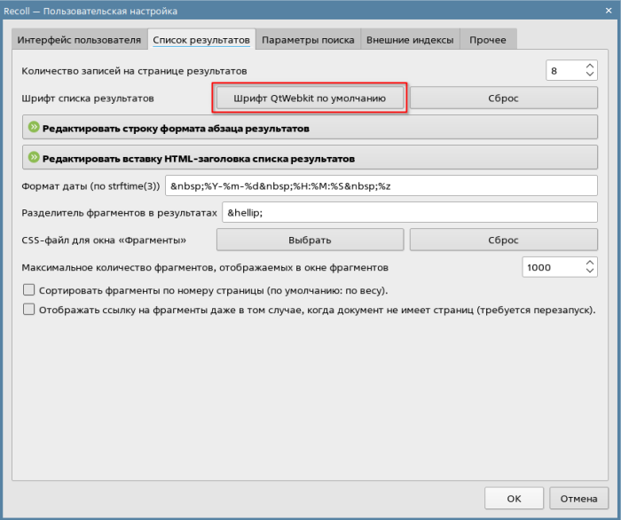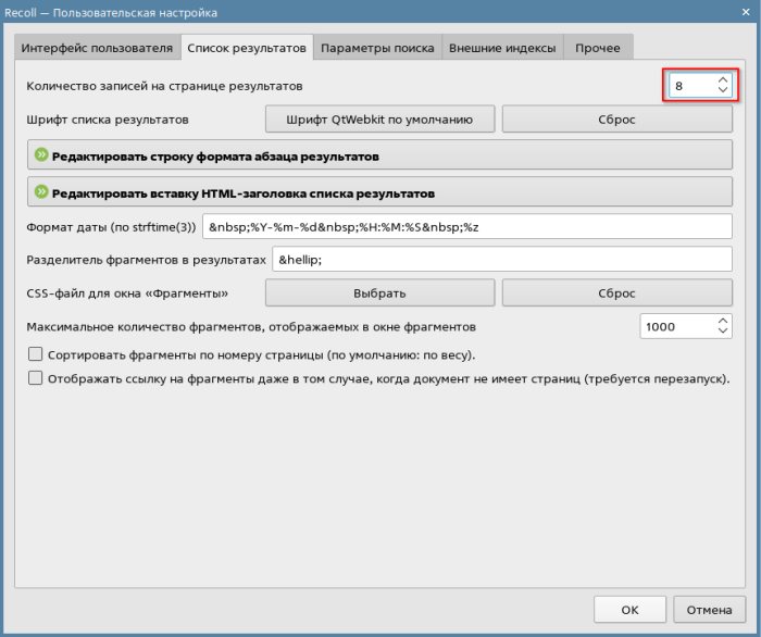 - в открывшемся окне Recoll — Пользовательская настройка перейти во вкладку Список результатов;