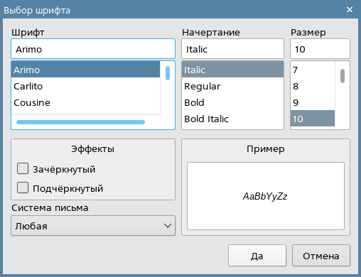 - в открывшемся окне Выбор шрифта следует выбрать необходимые настройки шрифта и нажать кнопку [Да];