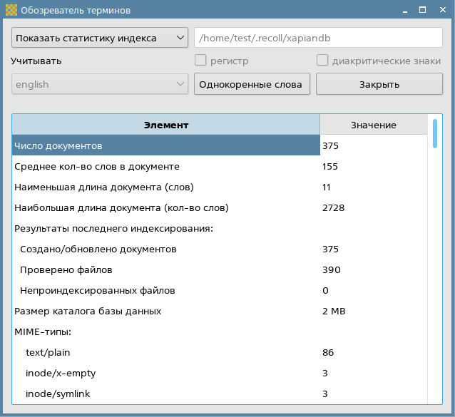 Для просмотра статистики индекса (число индексированных и неиндексированных файлов, размер базы данных и другую информацию), следует в строке меню выбрать Вид — Статистика индекса. Будет открыто окно обозревателя терминов с отображенной статистикой индекса.