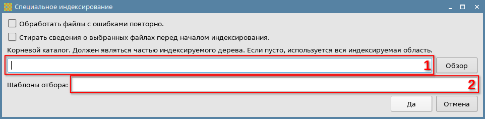 В поле Корневой каталог (1) следует ввести путь к корневому каталогу (внутри которого будут проиндексированы все файлы и подкаталоги) либо нажать кнопку [Обзор] и выбрать нужный каталог в открывшемся окне.