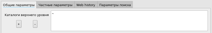 Для выбора каталогов верхнего уровня индекса (каталогов, содержимое которых будет добавлено в индекс), следует в строке меню выбрать Настройка — Настройка индекса. Будет открыто окно настроек индексирования. Список каталогов верхнего уровня отображается во вкладке Общие параметры, в поле Каталоги верхнего уровня.