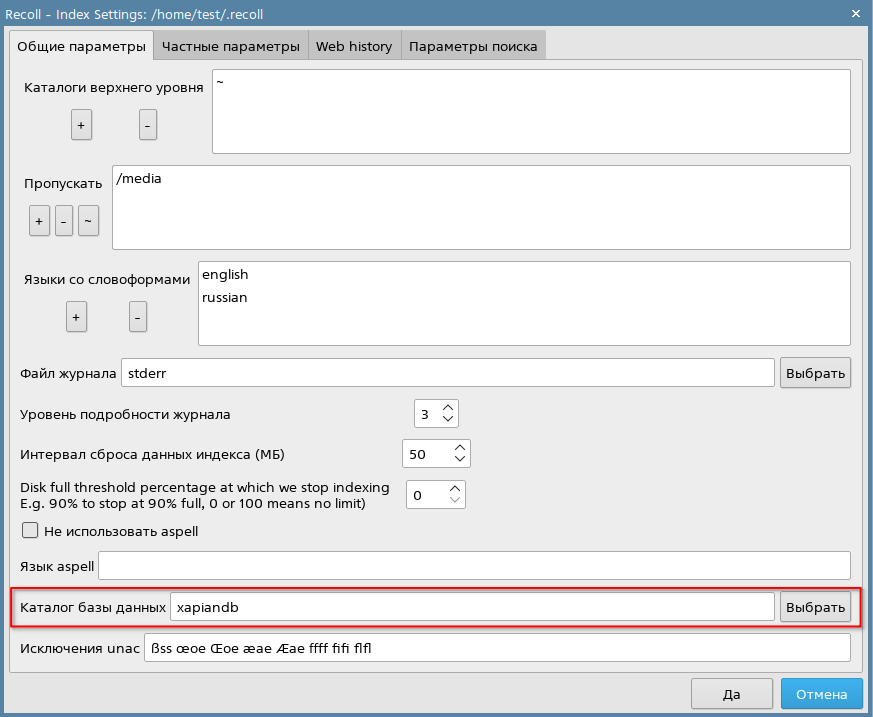 - в окне Recoll — Пользовательская настройка нажать кнопку [ОК] для сохранения настроек.
