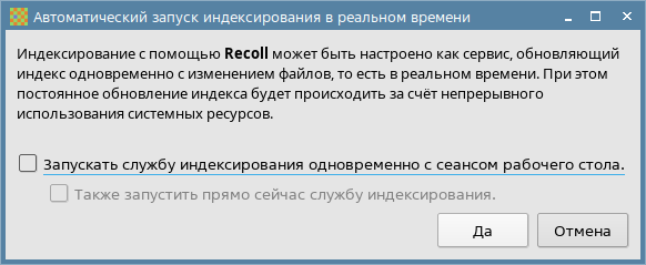 Для включения индексирования в реальном времени следует установить флаг Запускать службу индексирования одновременно с сеансом рабочего стола. Индексирование в реальном времени начнется при следующем входе в сессию.