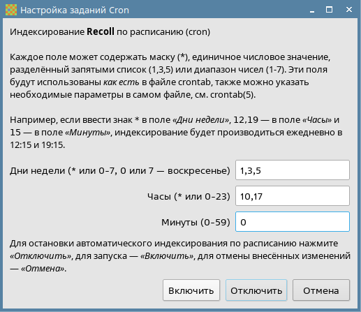 Для запуска индексирования по расписанию следует нажать кнопку [Включить], для остановки — [Отключить].