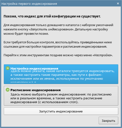 Для изменения настроек индексирования (см. Настройки индексирования) следует нажать кнопку [Настройка индексирования]. Для запуска индексирования с заданными настройками следует нажать кнопку [Запустить индексирование].