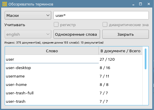 Столбец Слово содержит перечень найденных терминов, а столбец В документе / Всего —количество найденных вхождений каждого термина.