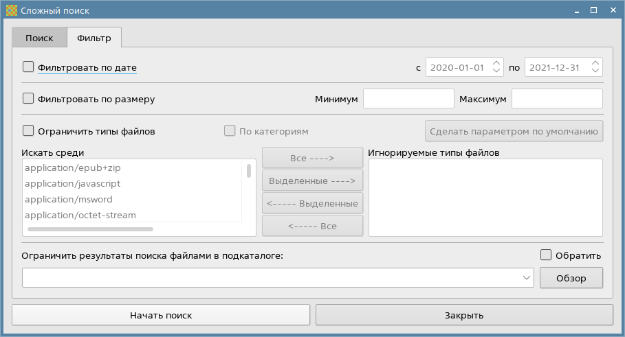 Для перемещения всех категорий файлов из поля Искать среди в поле Игнорируемые типы файлов следует нажать кнопку [Все ----->].