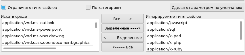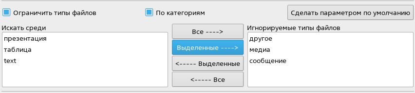Для включения категории файлов в поиск следует в поле Игнорируемые типы файлов выбрать нужную категорию файлов и нажать кнопку [<----- Выделенные]. Выбранная категория файлов будет перемещена в поле Искать среди и включена в поиск.