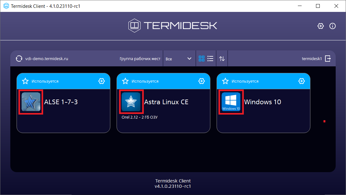 После добавления изображений гостевых ОС в Termidesk пользователь, подключившись к серверу через компонент «Клиент», увидит их в своем интерфейсе.