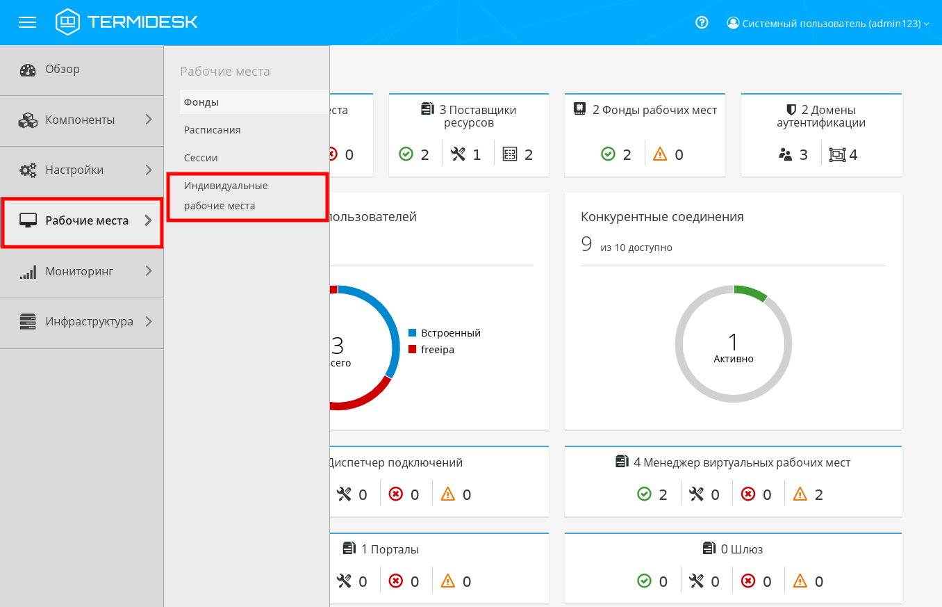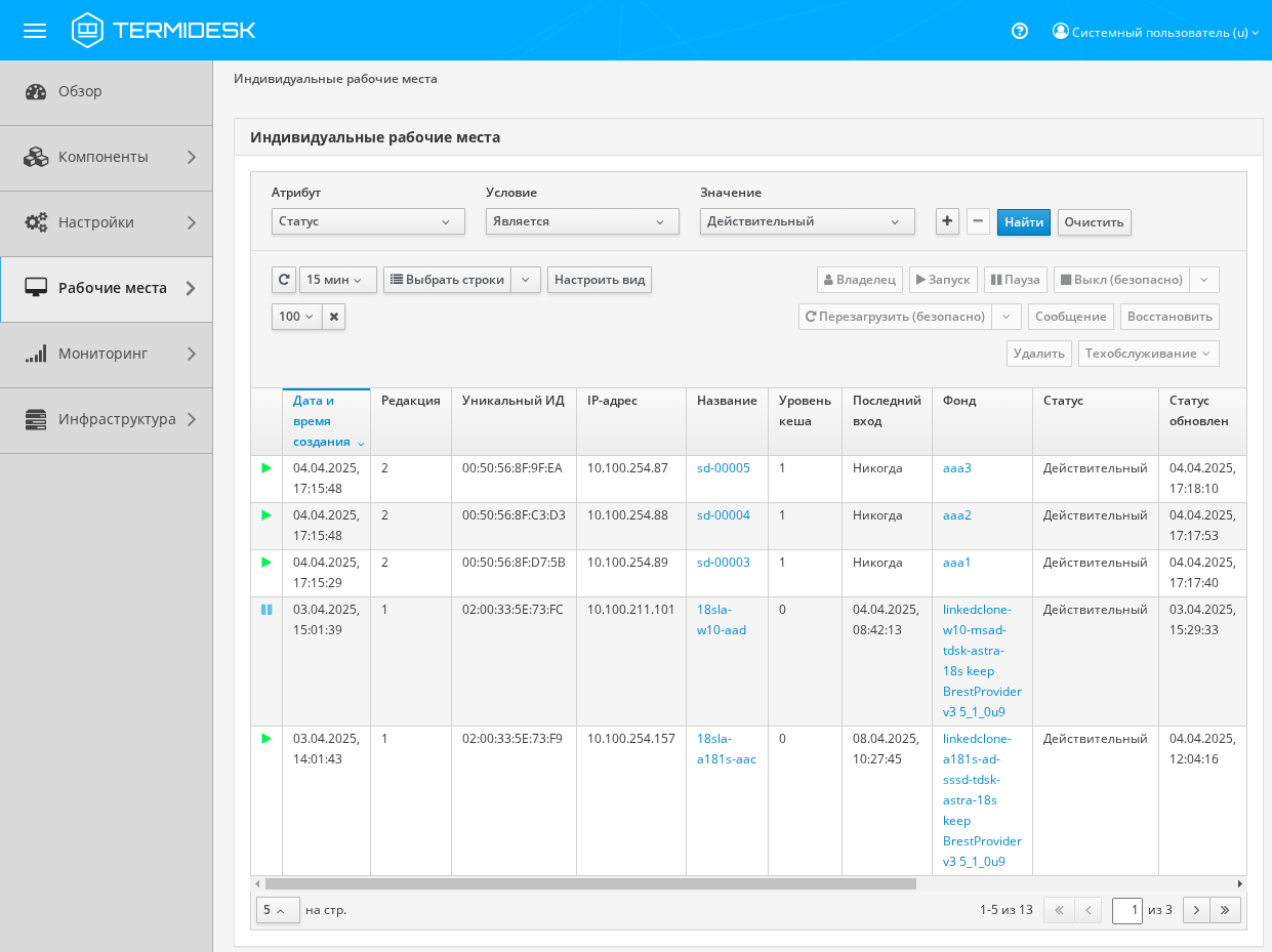 Для более эффективного администрирования Termidesk предусмотрено отображение РМ из всех фондов, в том числе назначенных РМ, а также созданных и размещенных в кеше.