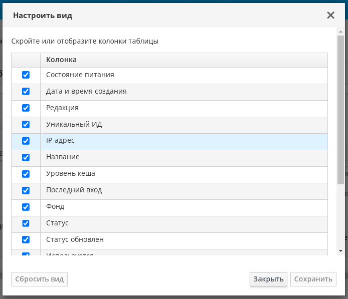 - список отображаемых столбцов. Для изменения списка нужно воспользоваться экранной кнопкой [Настроить вид] и отметить наименования столбцов, которые будут отображены, или снять отметку с наименований, которые должны быть скрыты из отображения. Для применения изменений нажать экранную кнопку [Сохранить]. При попытке убрать выбор со всех пунктов экранная кнопка [Сохранить] будет заблокирована. Для возврата к исходному состоянию отображения следует воспользоваться экранной кнопкой [Сбросить вид];