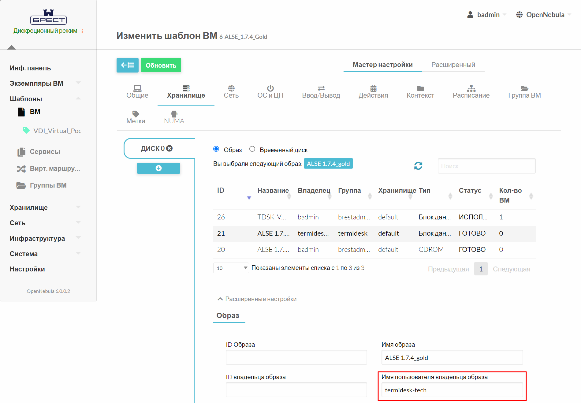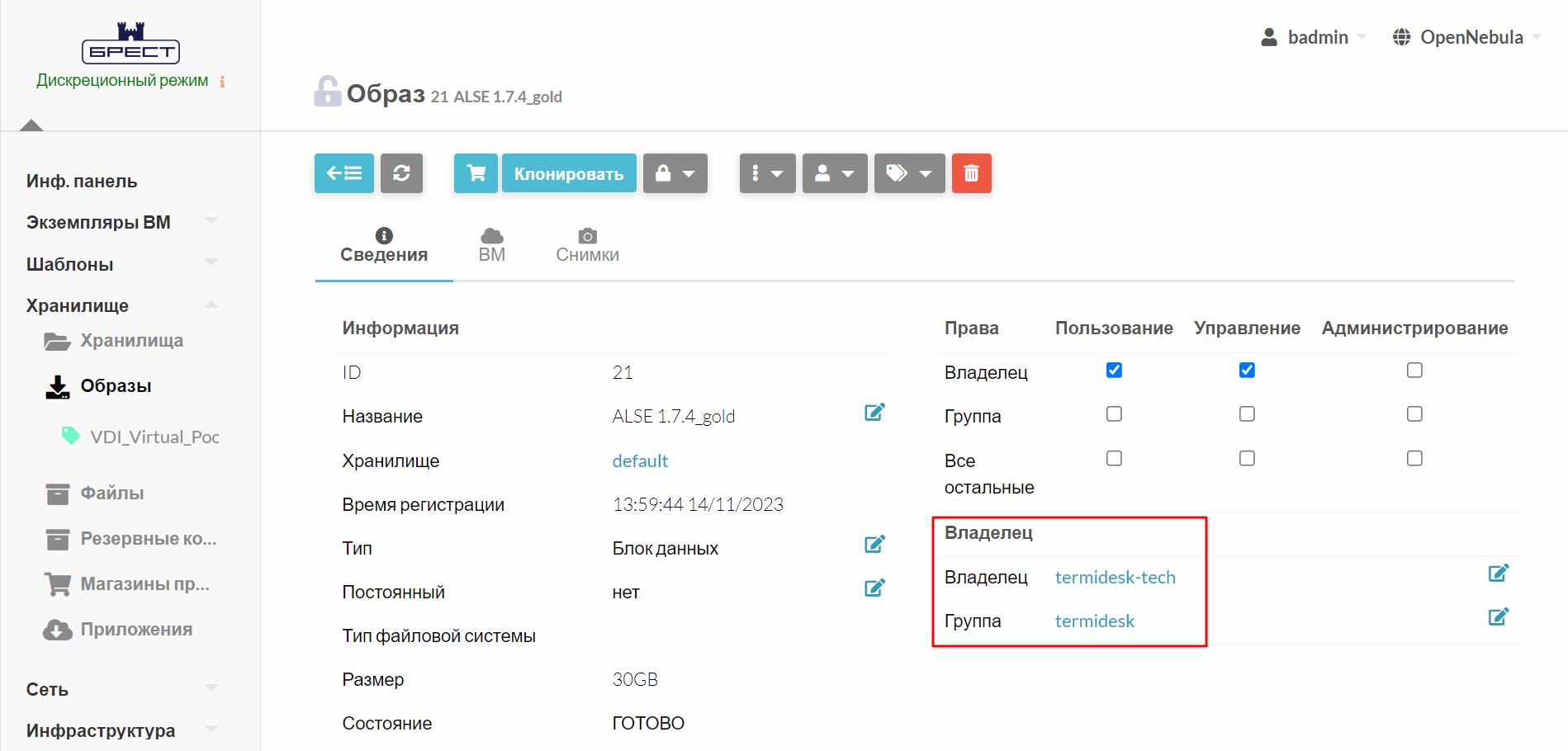 • перейти «Хранилище — Образы», выбрать соответствующий образ для тиражирования виртуальных рабочих мест (ВРМ) и в разделе «Владелец» назначить: «Владелец» — termidesk-tech; «Группа» — termidesk;