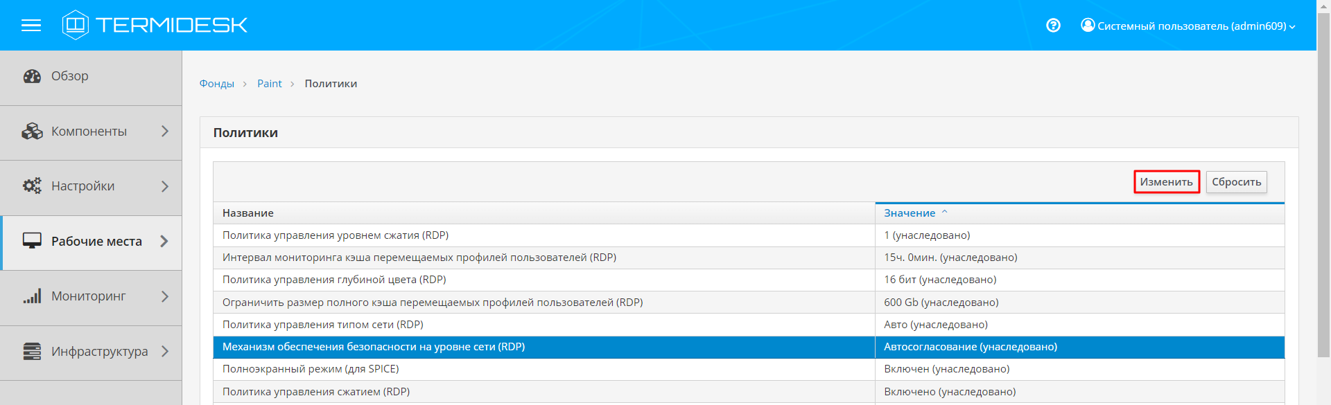 Для настройки обеспечения безопасности на уровне сети следует перейти «Рабочие места — Фонды», в сводной таблице в столбце «Фонд рабочих мест» выделить фонд с опубликованным приложением и нажать экранную кнопку [Политики].