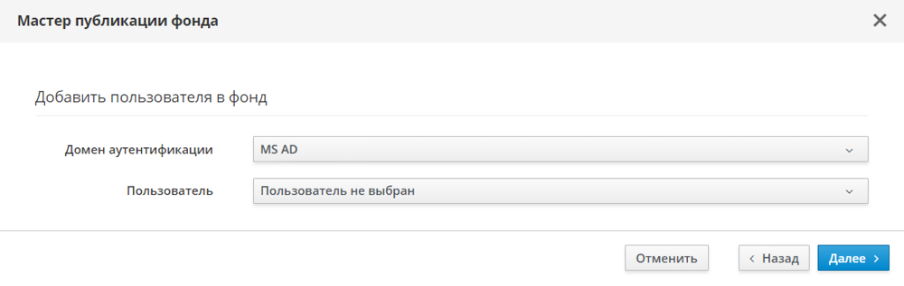 Затем выбрать пользователя домена аутентификации. Шаг опционален: параметры можно добавить после завершения работы мастера публикации, в созданном фонде на странице «Рабочие места - Фонды».