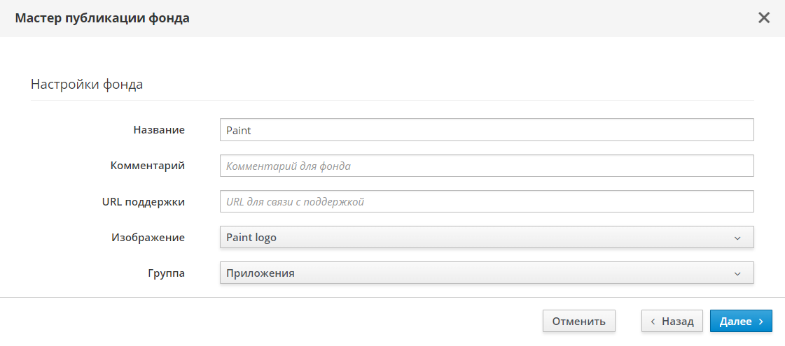В форме «Настройки фонда» нужно заполнить поля «Название», «Изображение» и «Группа».